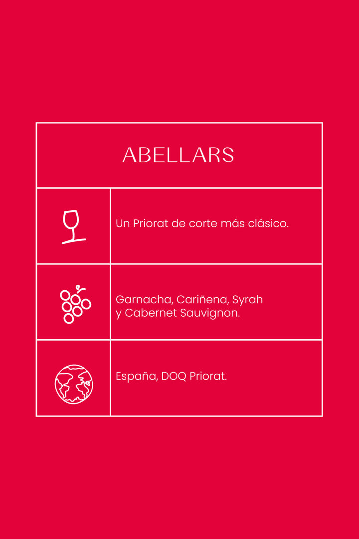 Abellars, es un vino del Priorat, de un corte más clásico, manteniendo la Garnacha y la Cariñena como uvas más representativas. Celler Noguerals, con su Titi y Abellars, nos muestran la tipicidad del Priorat en sus tintos.