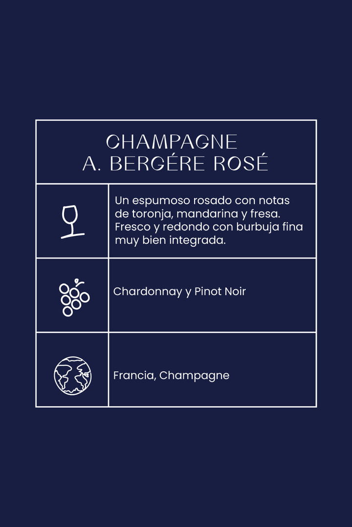 Desde 1848, la familia A. Bergère, está elaborando Champagne en la zona de Epernay, de las más reconocidas. 50 hectáreas de Agricultura sostenible.
