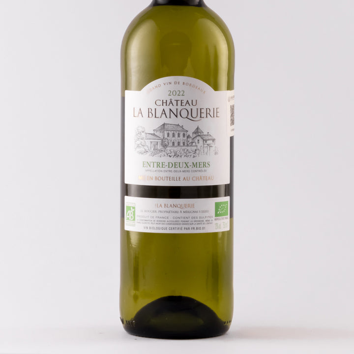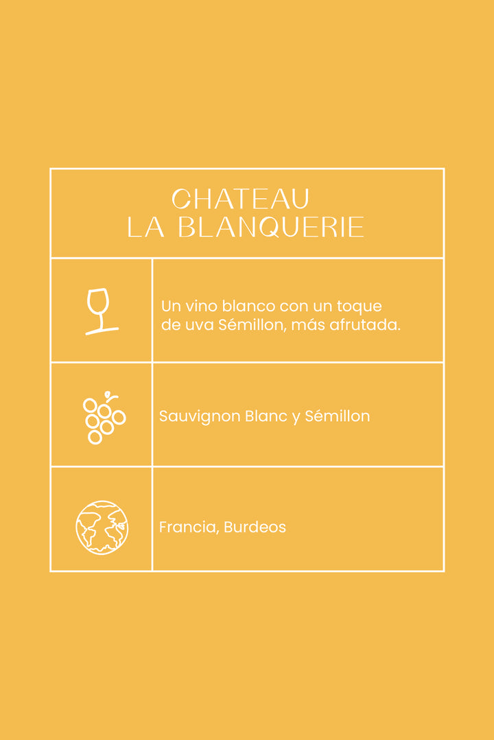 En la zona de Burdeos, los blancos siempre son de uva Sauvignon Blanc, la segunda uva más plantada en el mundo. Este blanco expresa la tipicidad de la zona de Entre Deux Mers, más cálida de la zona sur de Burdeos, con un toque de uva Sémillon, más afrutada.