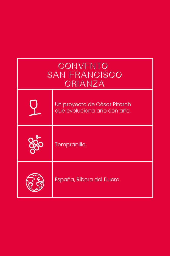 Convento San Francisco, es una bodega que se crea en el año 1998 de la mano de César Pitarch. Con su crianza, año tras año va expresando la evolución de estos viñedos de más de 50 años.