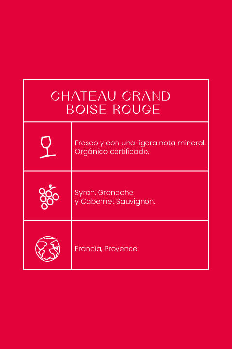 Tinto de la zona de Provence, muy fresco y con una ligera nota mineral. Las notas de hierbas aromáticas destacan en este vino, que cuenta con la asesoria del enólogo Xavier Ausas. Orgánico certificado.
