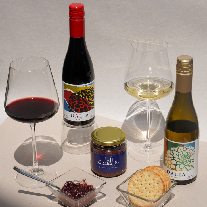 Dos medias botellas de vino mexicano; Dalia (blanco y tinto joven, 375 ml), acompañadas de galletas gourmet artesanales y chutney de higo con cebolla morada y mostaza antigua (agridulce, perfecto para quesos y carnes frías). Un detalle elegante para compartir.