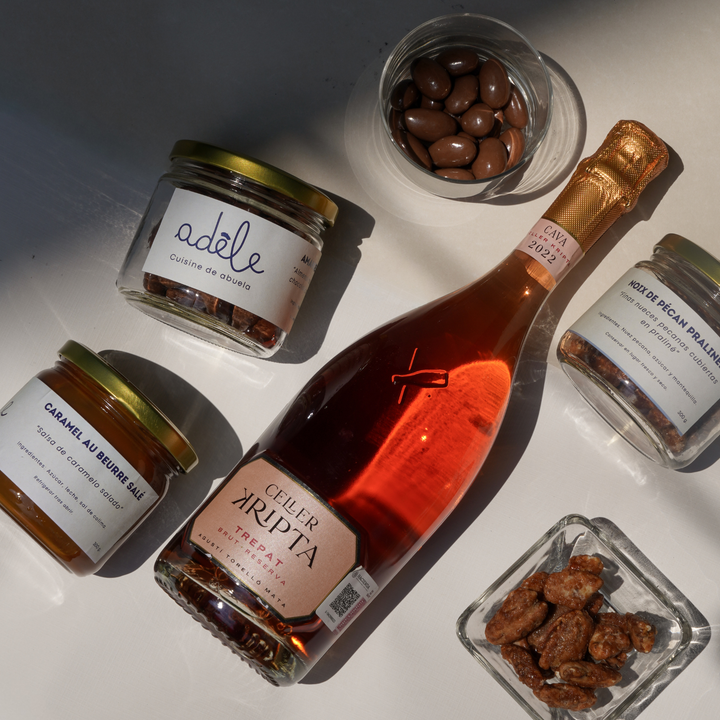 Celler Kripta Trepat Rosado (refrescante y frutal), acompañado de caramelo salado francés, pecanas cubiertas en praliné y almendras tostadas bañadas en chocolate. El regalo perfecto para los amantes de los postres y el vino espumoso rosado.
