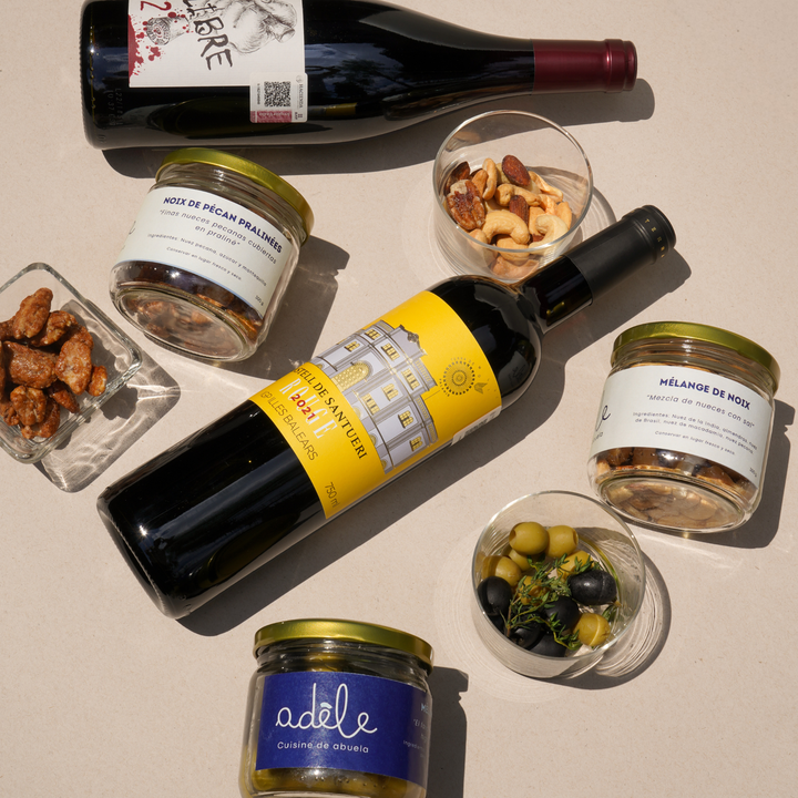 Dos vinos tintos, Calibre 12 y Castell de Santueri, acompañados de mezcla de nueces seleccionadas, mezcla de aceitunas negras y verdes con hierbas mediterráneas y pecanas en praliné. Perfecto para compartir en reuniones.