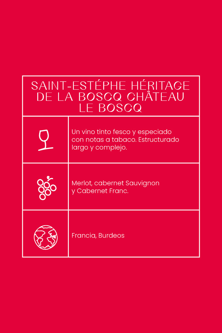 En la zona izquierda de Burdeos, Saint Estèphe es una de las zonas con mejores vinos. Chateau Le Boscq es una bodega que cuenta con 18 hectáreas.