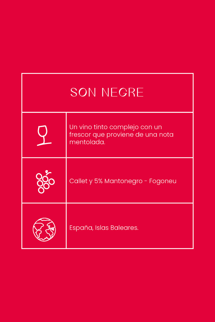 Son Negre, es el vino de alta gamma de Miquel Àngel Cerdà, de Ànima Negre, en Mallorca, al sur de la isla. Elaborado únicamente con uva Callet, autóctona recuperada. Cada diseño de la etiqueta está elaborado por un pintor.
